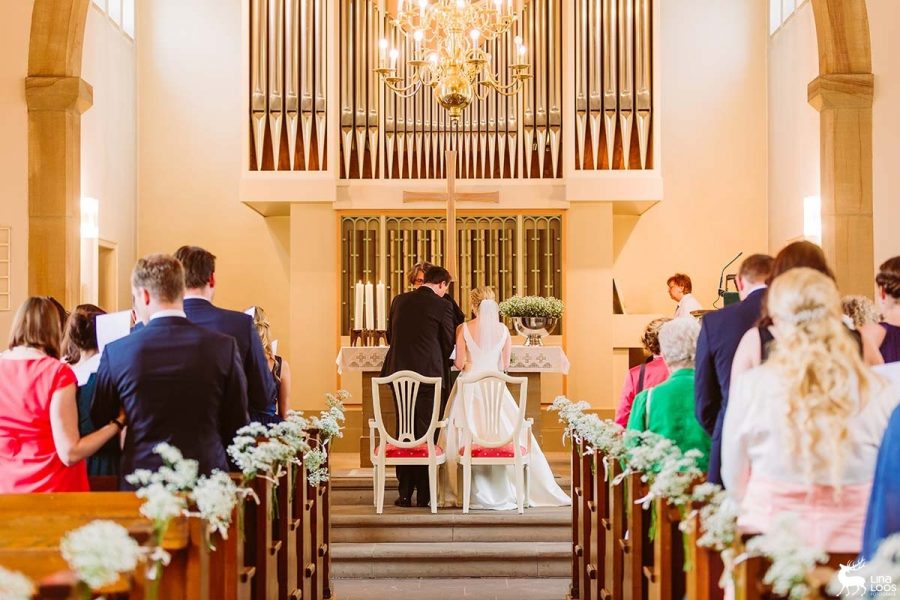 Die Gäste versammelten sich vor der gegenüberliegenden Kirche, als Sonja und Tobias eintrafen und sie begrüßten. Die Mutter von Tobias ist evangelische Pastorin. Sie traute die beiden. So wurde die Trauung sehr persönlich und emotional gehalten. Es waren wirklich sehr schöne und einzigartige Momente.
